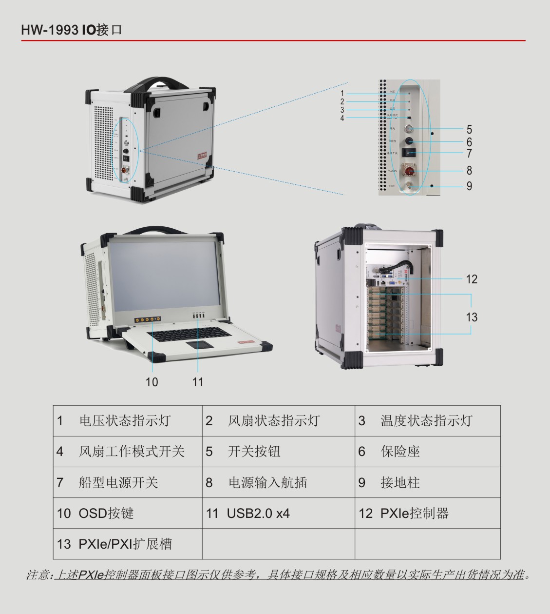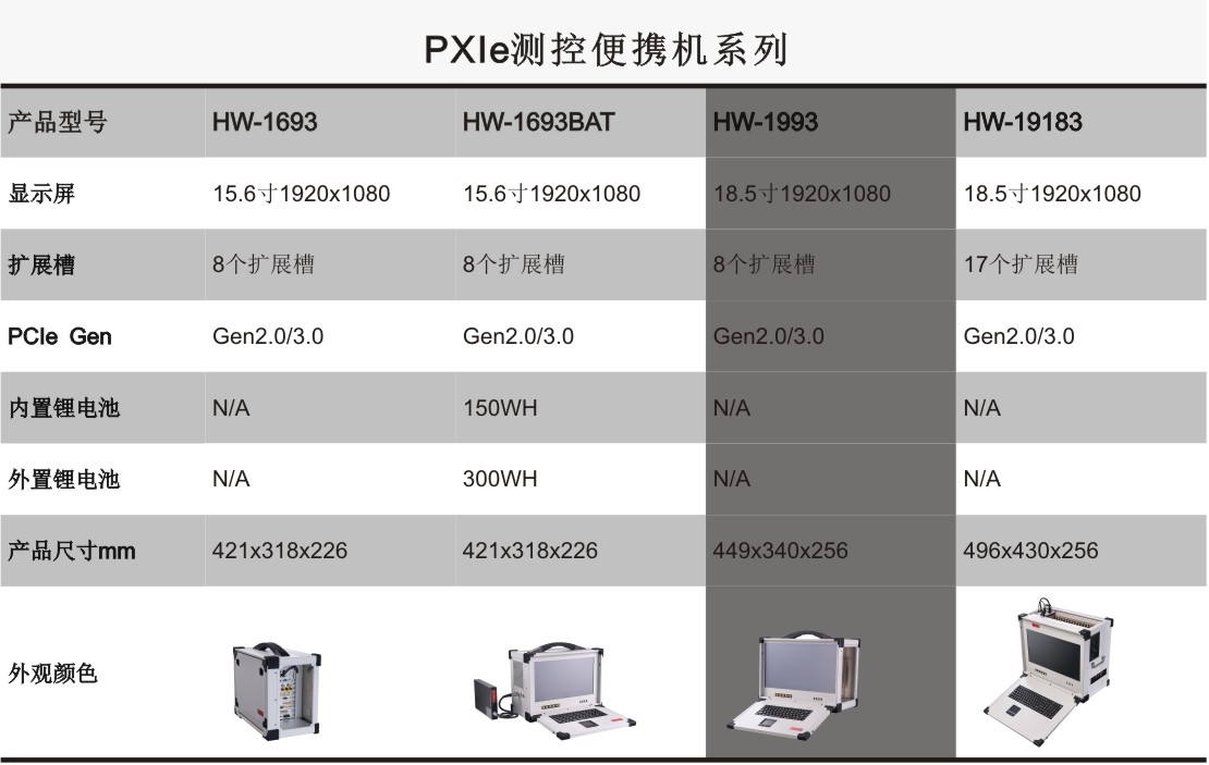 HW-1993是业界首款18.5''内置嵌入式PXIe控制器、PXIe背板、高清工业显示屏和加固机箱的便携式测控平台,此测控平台采用专业的工业外观设计、全铝镁合金结构加固紧凑型设计,集成18.5''高清工业显示屏、工业电阻触摸屏、工业触摸板、防水硅胶键盘和测控电源等,具有高集成、强固、便携等特点,适用于各种恶劣的户内外环境或测试设备便携移动的复杂工况。