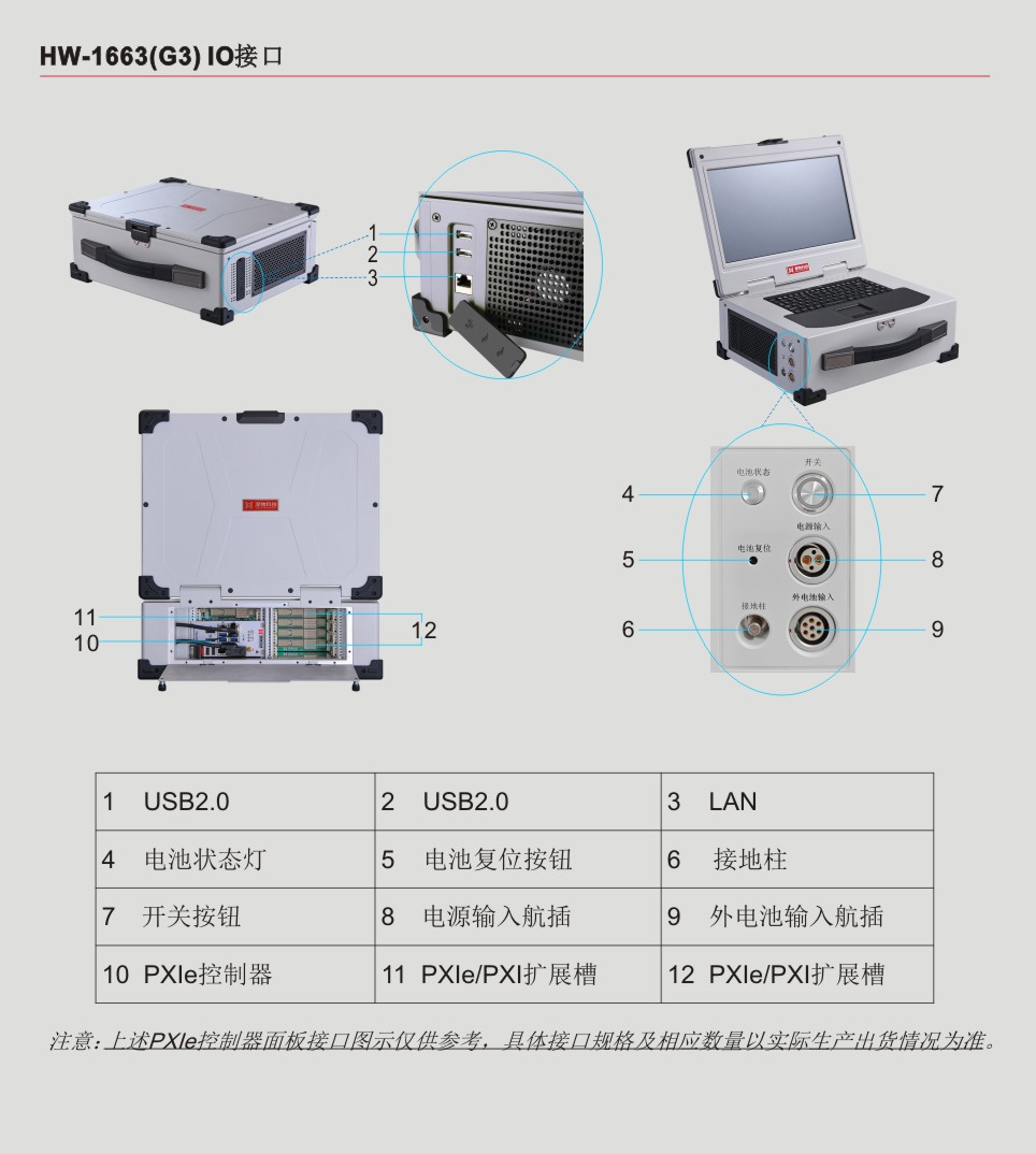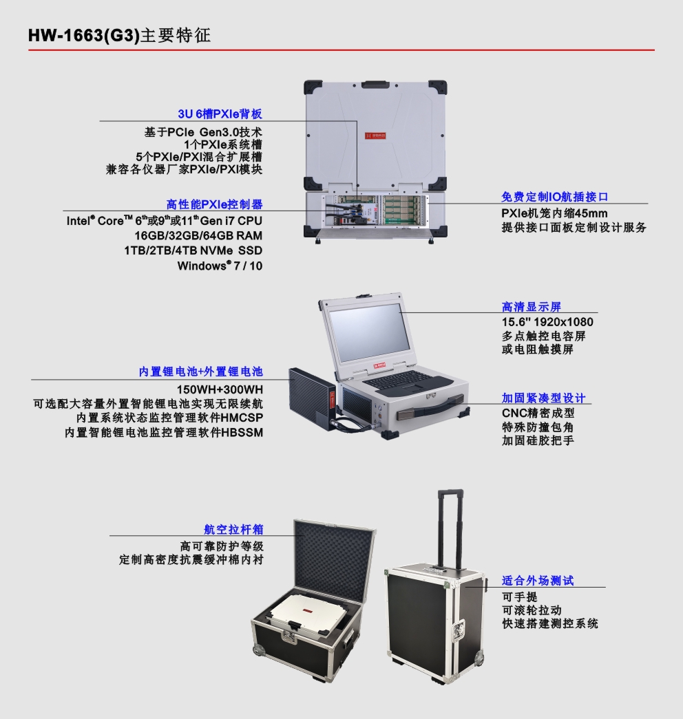 HW-1663是业界首款15.6’’内置Intel® CoreTM 6th或11th Gen i7四核八线程或八核十六线程CPU嵌入式PXIe控制器、PXIe背板、智能锂电池、高清工业显示屏和加固机箱的测控笔记本,此PXIe笔记本采用专业的工业外观设计、全铝镁合金结构加固紧凑型设计,集成15.6’’高清工业显示屏、多点触控电容触摸屏或电阻触摸屏、工业触摸板、防水硅胶键盘和智能锂电池等,具有高集成、强固、便携等特点,适用于各种恶劣的户内外环境或测试设备便携移动的复杂工况。
