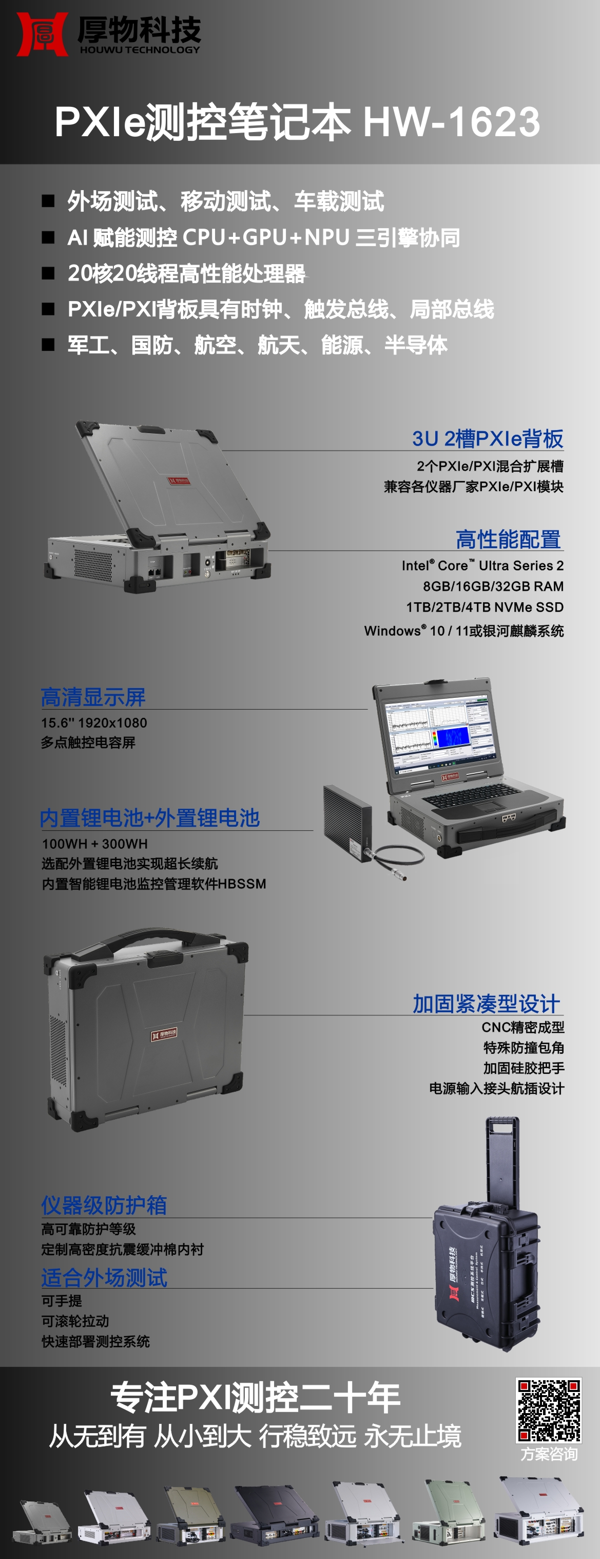 HW-1623U是业界首款内置Intel® Core™ Ultra Series 2处理器CPU、PXIe/PXI混合扩展槽背板、智能锂电池、15.6’’高清显示屏、多点触控电容触摸屏的3U 2槽PXIe笔记本,此PXIe笔记本采用专业的工业外观设计、全铝镁合金结构加固紧凑型设计,集成工业触摸板、防水硅胶键盘等,具有高集成、强固、便携等特点,适用于各种恶劣的户内外环境或测试设备便携移动的复杂工况。