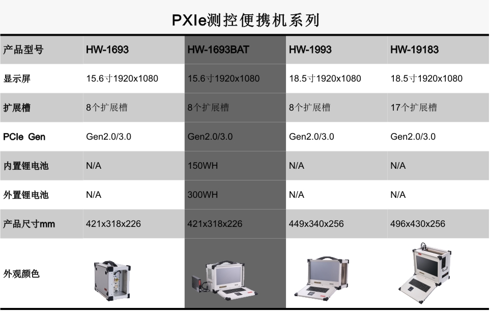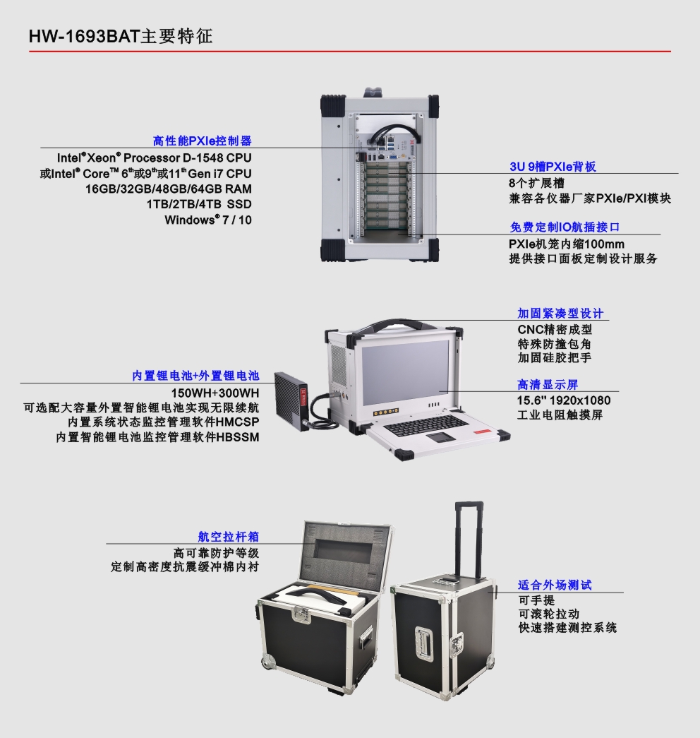 HW-1693BAT是业界首款15.6’’内置嵌入式PXIe控制器、PXIe背板、智能锂电池、高清工业显示屏和加固机箱的便携式测控平台,此测控平台采用专业的工业外观设计、全铝镁合金结构加固紧凑型设计,集成15.6’’高清工业显示屏、工业电阻触摸屏、工业触摸板、防水硅胶键盘和智能锂电池等,具有高集成、强固、便携等特点,适用于各种恶劣的户内外环境或测试设备便携移动的复杂工况。HW-1693BAT(G3)