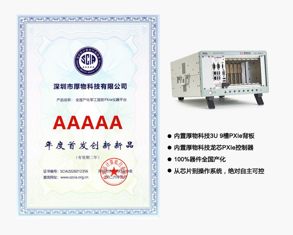 深圳市厚物科技有限公司立足中国深圳,持续专注于PXIe PXI CPCI VPX模块化仪器测控系统平台的研发与生产,提供便携式、车载式、台式、手持式、机架式五大系列MCS测控系统平台,包括外场便携式测试设备、加固机架式测试设备、手持式仪器、车载式设备等,多款创新型设备已列装到军工国防、航空航天、兵器电子、船舶舰载等装备保障领域,是行业第一测控系统平台服务商。