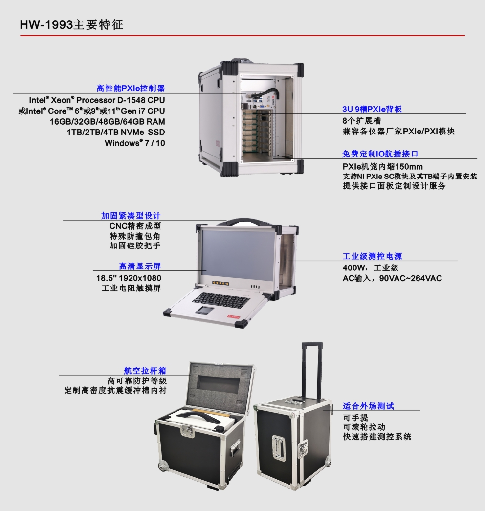 HW-1993是业界首款18.5''内置嵌入式PXIe控制器、PXIe背板、高清工业显示屏和加固机箱的便携式测控平台,此测控平台采用专业的工业外观设计、全铝镁合金结构加固紧凑型设计,集成18.5''高清工业显示屏、工业电阻触摸屏、工业触摸板、防水硅胶键盘和测控电源等,具有高集成、强固、便携等特点,适用于各种恶劣的户内外环境或测试设备便携移动的复杂工况。